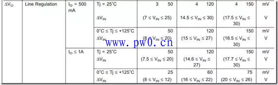 线性调整率是输入电压有一定的变化范围,那么输出电压变化多少,如下图是7805的线性调整率