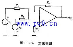 图13-32是运算放大器组成的加法器。两个输入信号U1、U2加到反相输入端,加法放大器将交流信号或直流信号相加,输出信号是两个输入信号的反相和。