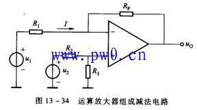 运算放大器也能组成减法器。图13-34显示了可提供两个输入信号相减的电路。电路工作过程是: