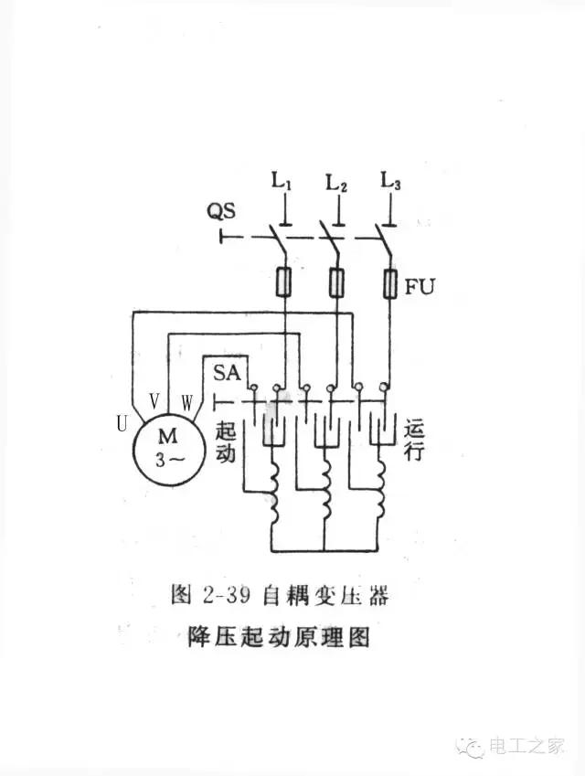 启动时,转换开关SA扳向“启动”位置,此时电动机定子绕组与自耦变压器的低压侧连接,电动机进行降压启动,待转速上升到一定值时,再将SA扳向“运行”位置,这时自耦变压器被切除,电动机定子绕组全压运行。
