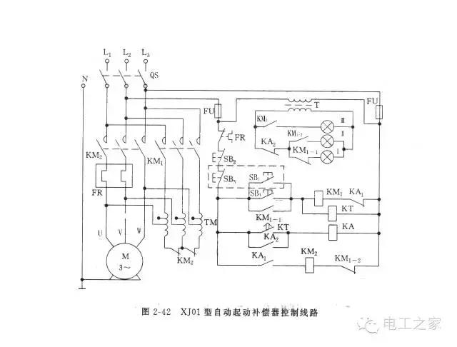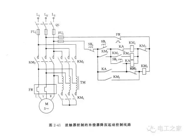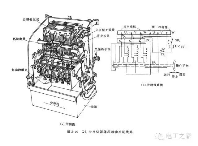 手动控制所采用的补偿器有QJ3、QJ5型。图2-40为QJ3型启动补偿器的结构图与控制线路图。
