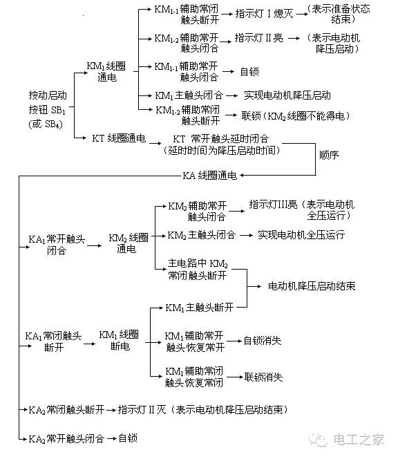 降压启动过程中,接触器KM1,时间断电器KT工作,而接触器KM2和中间继电器KA不工作。电路进入全压运行后,情况正相反,接触器KM2和中间断电器KA工作,而接触器KM1和时间继电器KT不工作。