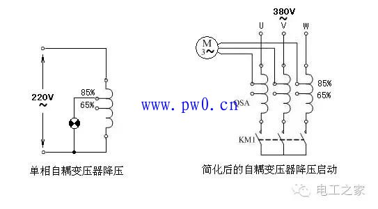 自耦变压器具有多个抽头,可以获得不同的变化,比Y-△降压启动方法的启动电流、启动转矩选择灵活。