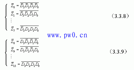 式(3.3.8)表明时第(1)片74LS138工作而第(2)片74LS138禁止,将的0000~0111这8个代码译成8个低电平信号。而式(3.3.9)表明时,第(2)片74LS138工作,第(1)片74LS138禁止,将的1000~1111这8个代码译成8个低电平信号。这样就用两个3线-8线译码器扩展成一个4线-16线的译码器了。