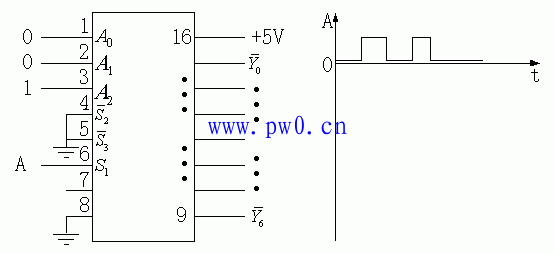 例2. 74LS138 3-8译码器的各输入端的连接情况及第六脚()输入信号A的波形如下图所示。试画出八个输出管脚的波形。