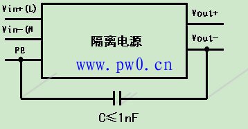 那么,如果隔离电源在应用过程中一定要进行输出Vout-连接到PE端,可以按照上图的连接思路,通过电容将这两个端子进行连接,这样设计保证了客户特殊使用要求的同事,对于上述问题也能够有效的规避。