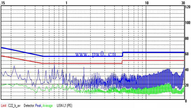 上图为MORNSUN电源LH15-10B05的电源应用到某品牌产品上面后,整机测试传导骚扰结果,此结果无法符合EN55022/CISPR22的CLASS B要求,甚至连CLASS A都无法满足要求,更不用说设计余量。