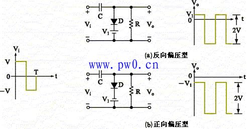 Vi正半周时;开始充电,电容C充电至V值,此时钳位二极管导通,Vo=0V。