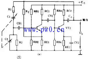 图5(a)是一种常见的RC桥式振荡电路。图中左侧的R1C1和R2C2串并联电路就是它的选频网络。这个选频网络又是正反馈电路的一部分。这个选频网络对某个特定频率为f0的信号电压没有相移(相移为0°),其它频率的电压都有大小不等的相移。由于放大器有2级,从V2输出端取出的反馈电压Uf是和放大器输入电压同相的(2级相移360°=0°)。因此反馈电压经选频网络送回到VT1的输入端时,只有某个特定频率为f0的电压才能满足相位平衡条件而起振。可见RC串并联电路同时起到了选频和正反馈的作用。