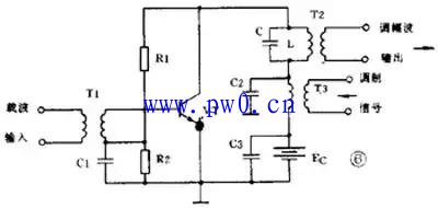 图6是集电极调幅电路,由高频载波振荡器产生的等幅载波经T1加到晶体管基极。低频调制信号则通过T3耦合到集电极中。C1、C2、C3是高频旁路电容,R1、R2是偏置电阻。集电极的LC并联回路谐振在载波频率上。如果把三极管的静态工作点选在特性曲线的弯曲部分,三极管就是一个非线性器件。因为晶体管的集电极电流是随着调制电压变化的,所以集电极中的2个信号就因非线性作用而实现了调幅。由于LC谐振回路是调谐在载波的基频上,因此在T2的次级就可得到调幅波输出。
