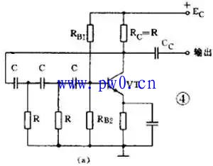 图4(a)是RC相移振荡电路。电路中的3节RC网络同时起到选频和正反馈的作用。从图4(b)的交流等效电路看到:因为是单级共发射极放大电路,晶体管VT的输出电压Uo与输出电压Ui在相位上是相差180°。当输出电压经过RC网络后,变成反馈电压Uf又送到输入端时,由于RC网络只对某个特定频率f0的电压产生180°的相移,所以只有频率为f0的信号电压才是正反馈而使电路起振。可见RC网络既是选频网络,又是正反馈电路的一部分。