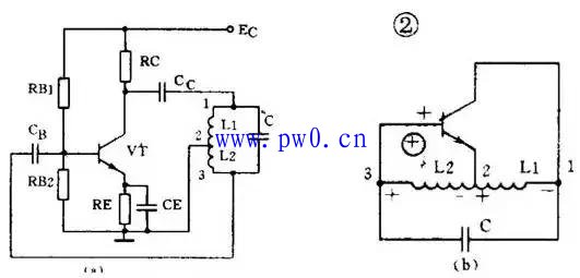 图2(a)是另一种常用的电感三点式振荡电路。图中电感L1、L2和电容C组成起选频作用的谐振电路。从L2上取出反馈电压加到晶体管VT的基极。从图2(b)看到,晶体管的输入电压和反馈电压是同相的,满足相位平衡条件的,因此电路能起振。由于晶体管的3个极是分别接在电感的3个点上的,因此被称为电感三点式振荡电路。