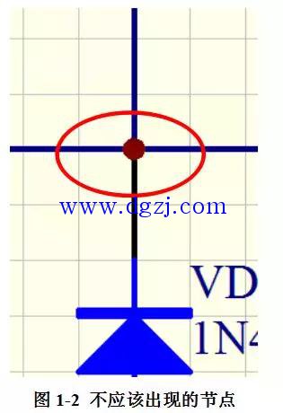 对于像图1-2的这种情况,就需要删除节点,单击需要删除的节点,在其选中状态下,按下“Delete”,就能对其进行删除操作。当然,还有极少部分的情况下,需要对绘制的SCH图进行节点的添加,这时候只需要通过【Place/Junction】,就可以放置节点了。