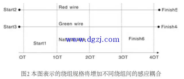 在制造门脉冲驱动变压器时,其漏感值可以在生产过程中用适当的卷绕方法进行限制。图2示出的绕组的技术要求,在图的中心部位示出了卷绕绕组的方法。绕组的规范生产布置情况由图1C所示。图中标志出了两端点(起始点1和结束点6)的引出导线都在初级一侧。