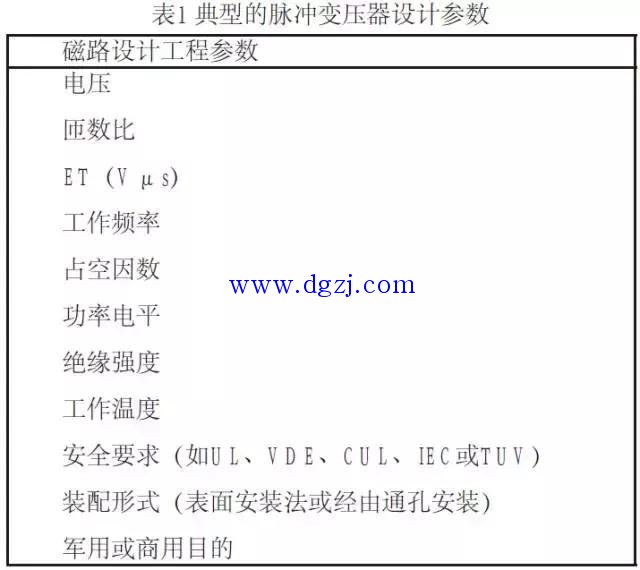 典型的门脉冲驱动变压器是用铁氧体磁心设计制造的,这样可以降低成本。常用磁心的外形大多数是EE、EER、ETD型。它们都是由“E”型磁心和相应的骨架组成。这些骨架可以采用表面安装法或通孔安装法装配。在有些情况下,也采用环形磁心设计制作门脉冲驱动变压器。典型的脉冲变压器设计所要求的参数列于表1。
