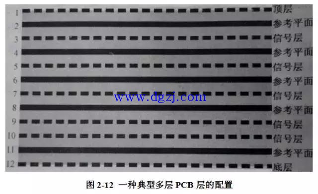 多层板常常出现在高速、高性能的系统中,其中的一些层是用来设置电源或地的,这些层将作为与之相邻的信号走线的电流返回路径。图2-12所示为一种典型多层PCB叠层的配置。