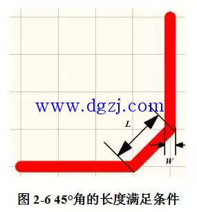 当然这两种拐角方式中圆角方式是最好的。45°拐角可以用到10GHz频率上,而且对于45°拐角走线来说,拐角的长度最好满足:L≥3W,如图2-6所示。