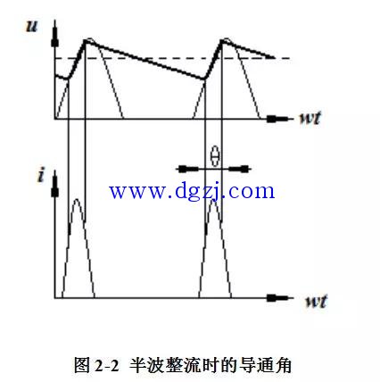 在未加滤波电容之前,整流电路中的二极管导通角θ为π。加滤波电容后,只有当电容充电时,二极管才导通,因此,每只二极管的导通角均小于π。随着滤波电容的增加,二极管的导通角将会越来越小,而根据傅里叶展开式1和图2-2可知,当导通角变小时,高次谐波就会增大,这样频率也就变大了,产生的辐射干扰也就增大了。