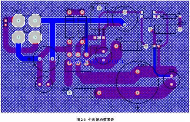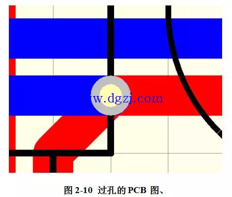 如图2-10示,为有过孔的PCB版图,但是通过更改线路的走向,完全可以避免此过孔的产生,修改后的如图2-11。