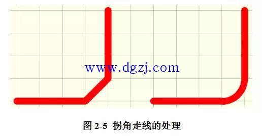 在走线确实需要直角拐角的情况下,通常就用两种方式来进行改进:其一是将90°拐角变成两个45°拐角;其二就是用圆角来替代90°拐角,如图2-5所示。