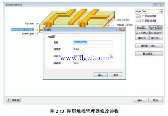 而层数的设置可以通过【Design/ Layer Stack Manager】进行层的添加、信号层的添加等,双击添加层的名字还能对层的属性进行修改,如图2-13所示。