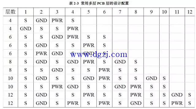 表2-3为常用多层PCB层的设计配置,如果在绘制多层的情况下,可将其作为一种参考。