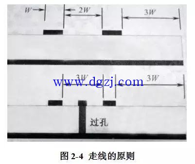 C.如果走线之间有过孔,那么走线间距应该大于或等于走线宽度的3倍,如图2-4所示。