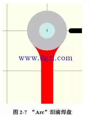 在高速电路中,为了使走线更加平稳、迅速的传递电流,Protel 99SE为我们提供了“泪滴焊盘”的功能。通过这个功能,能减小电流对于元器件焊盘的瞬间损伤,也能使电流的传递更加的快捷和稳定。在Protel 99SE中,可以设置两种泪滴焊盘的方式,一种是“Arc”,另一种是“Track”。它们分别如图2-7和图2-8所示。