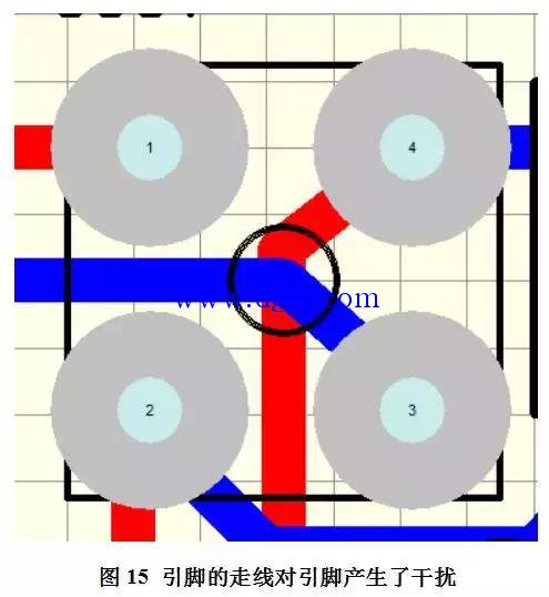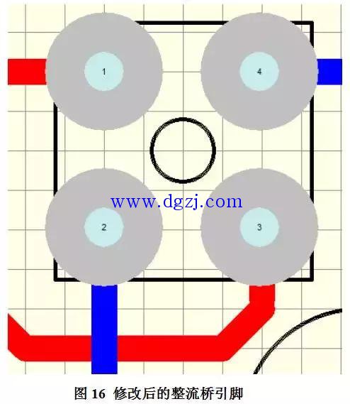 根据要求,一般在整流桥的四个孔周围2.54mm不能有线条,而在图15所示的电路中,在整流桥3号引脚的走线中,产生了对4号引脚的辐射干扰问题;同样2号引脚的走线也对3号引脚产生了干扰问题。所以这些都是不正确的走线。应该为如图16所示的走线方式。