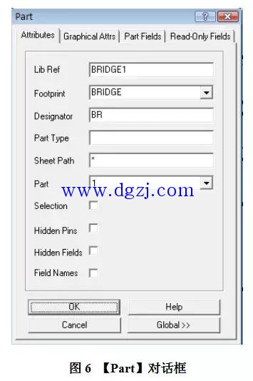 建立网络表前有个准备工作要做,就是对每个元器件要进行其封装的设置,双击图1-2中的整流桥,会出现【Part】对话框,在【Attributes】选项卡中的“Footprint”旁输入该整流桥的封装,在本论文的单片开关电源中,由于整流桥是自己绘制的,根据自己对元器件封装的命名,此处应为“BRIDGE”(如图6所示),输入后点击OK即可。