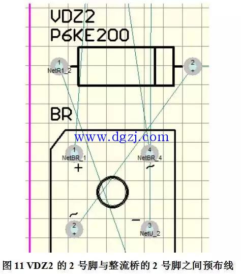 Protel 99SE对元器件进行好自动布局之后,我们可以手动根据预布线的连接进行布线,就如图11对VDZ2的2号脚和整流桥的2号脚进行手动布线。