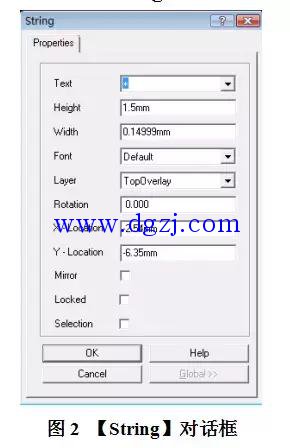 (3)根据整流桥的性能,对其四个引脚进行标示处理,通过【Place/String】,然后点击“Tab”键,弹出如图2所示的【String】对话框。