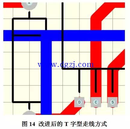 根据绘制高速电路PCB版图的要求,所有的导线应该越短越好,尽可能的精简,但是如图13为图12中截取的一小块PCB版图走线,其导线走线过于的复杂繁琐,更造成了导线与导线之间不必要的电磁辐射干扰。这里就能把走线从原来的两根还成T字型走线,如图14所示。