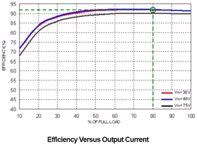 依规格书所提供的输出负载及输入电压对效率的曲线图可查出,在Vin=48V,Iout=80%满负载时的转换效率η=92%