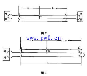 测量电路如图2所示,首先测出芯线a与b之间的电阻R1,则R1=2Rx+R,其中Rx为a相或b相至故障点的一相电阻值,R为短接点的接触电阻。再就电缆的另一端测出a′与b′芯线间的直流电阻值R2,则R2=2R(L-X)+R,式中R(L-X)为a′相或b′相芯线至故障点的一相电阻值,测完R1与R2后,再按图3所示电路将b′与c′短接,测出b、c两相芯线间的直流电阻值,则该阻值的1/2为每相芯线的电阻值,用RL表示,RL=Rx+R(L-X),由此可得出故障点的接触电阻值:R=R1+R2-2RL,因此,故障点两侧芯线的电阻值可用下式表示:Rx=(R1-R)/2,R(L-X)=(R2-R)/2。Rx、R(L-X)、RL三个数值确定后,按比例公式即可求出故障点距电缆端头的距离X或(L-X):X=(RX/RL)L,(L-X)=(R(L-X)/RL)L,式中L为电缆的总长度。