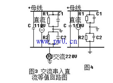 在发电厂,由于直流供电范围大,馈线电缆长,因而电缆对地阻抗等效为电阻与电容的并联回路;又因电缆运行年代久,当运行湿度较高时,直流母线对地电容将增大,其绝缘电阻也会降低。图3画出了交流串入直流回路的等效电路。