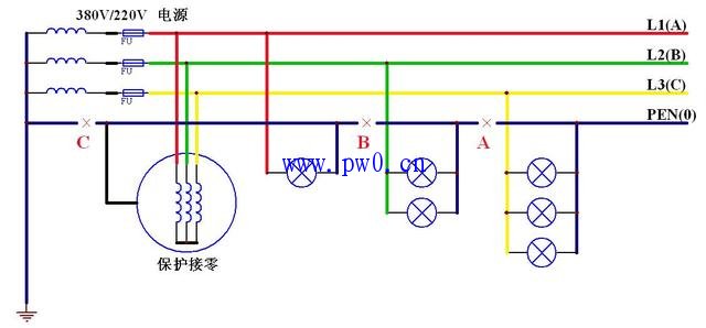 当零线在A点发生断线时(B点、C点未断线,下同),凡连接在断开点以后的单相负载,其火线、零线都带电,但却没有电压,因此,负载无法正常工作。