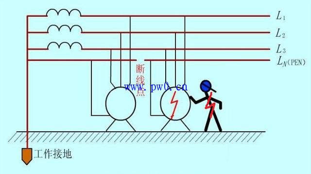通过对上述的讲解,相信大家都应该清楚采用保护接零的设备在零线断线后,将失去保护作用(一旦设备烧毁或漏电,设备外壳即带电)了,这也是零线严禁接开关或熔断器的道理。如下图:
