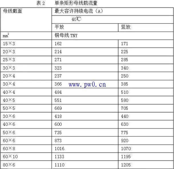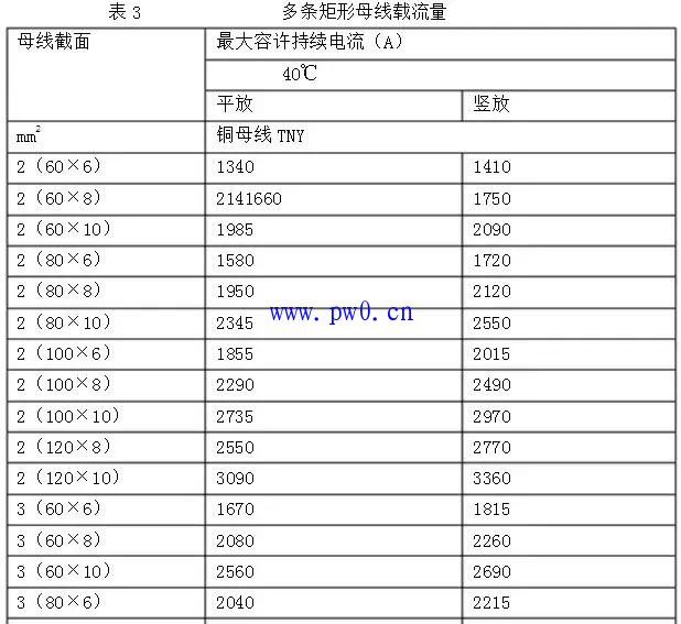3、主回路或分支回路选用母线时,依据额定电流在表2、表3中选用不小于该载流量的截面规格。