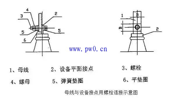 1、 直接连接的要求:当元件的端子是平面时,母线连接可直接用螺栓紧固如图,但紧固件必须是钢制的。