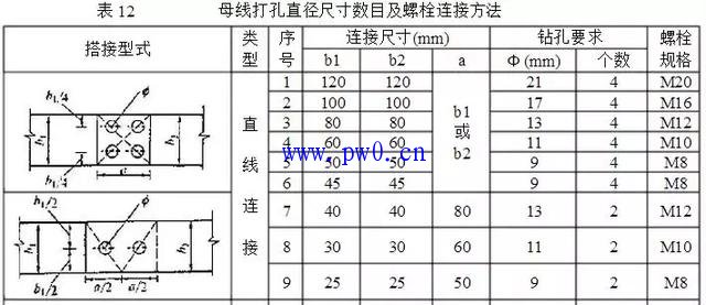 3、不同宽度的铜母线冲(钻)孔数目和孔径大小见表12。