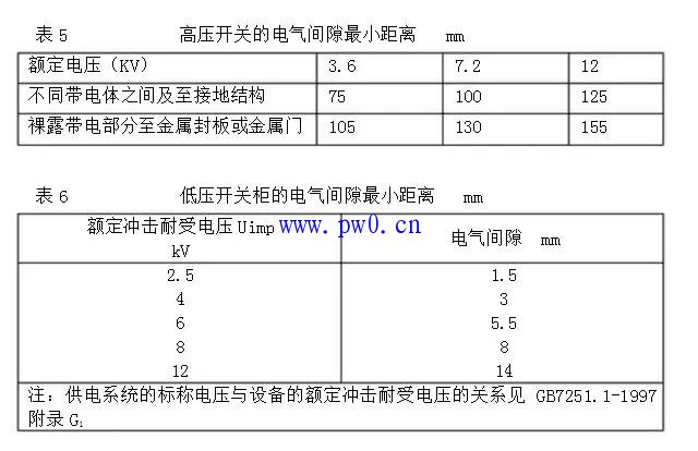 1、对于电器元件,带电零件部件及母线间的电气间隙,爬电距离不得小于表5、表6、表7所给定值。(为提高产品安全性能并便于施工,我厂低压开关柜要求电气间隙不小于15mm,爬电距离不小于20mm,如有特殊情况,也不得小于表6表7的值)。