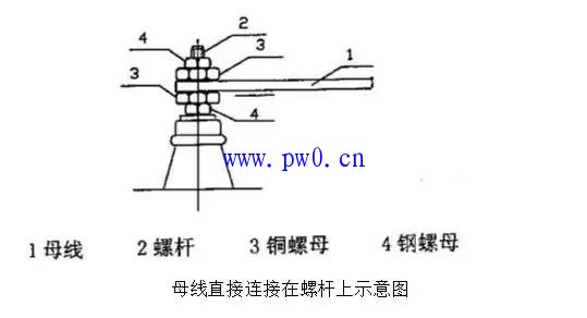 2 、当元件接头是螺杆时,母线可直接连接在螺杆上,如下图,为防止松动,需加锁母,在锁母之间不得加垫圈。