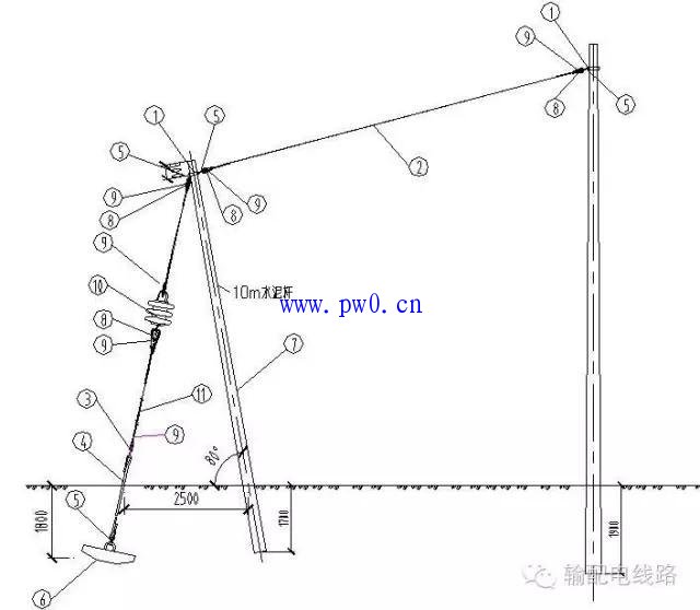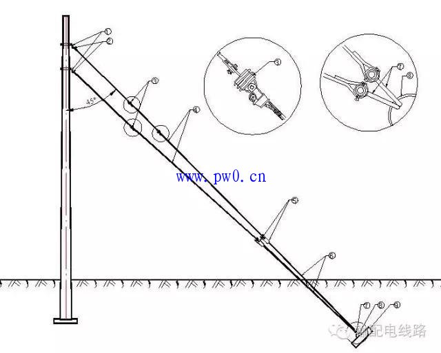 用于线路的终端杆塔、小角度的转角杆塔、耐张杆塔等处,主要起平衡张力的作用。一般和电杆成45°角,如果受地形限制时,不应小于30°、大于60°。