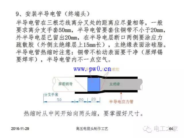 b、交联电缆因内应力处理不良时在运行中会发生较大收缩,因而在安装附件时 注意应力管与绝缘屏蔽搭盖不少于20mm,以防收缩时应力管与绝缘屏蔽脱离。