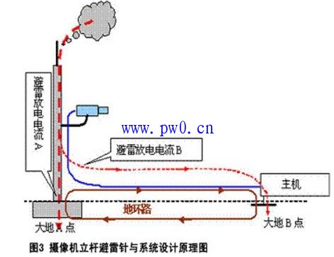 摄像机立杆避雷针化,就是指立杆按照避雷针设计,并强调摄像机外壳必须与金属立杆等电位连接。我们来分析防直击雷的“摄像机立杆避雷针化”,对安防系统的影响,其设计原理如图3所示。
