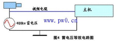 4)空气的击穿电压大约为30KV/cm,400千伏的“雷电压”加在摄像机和视频电缆屏蔽层上,殃及全系统所有电气连接设备,足以击穿摄像机、解码器、电源设备的电路板,烧毁电子元件,击穿线缆的绝缘,主机系统也难逃厄运。