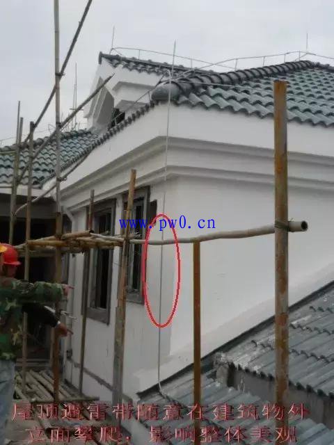 ①屋顶避雷针设置不规范,用圆钢代替专用避雷针。