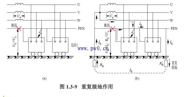 从图1.3-9(a)可以看出,一旦中性线断线,设备外露部分带电,人体触及同样会有触电的可能。而在重复接地 的系统中,如图1.3-9(b)所示,即使出现中性线断线,但外露部分因重复接地而使其对地电压大大下降,对人体的 危害也大大下降。不过应尽量避免中性线或接地线出现断 线的现象。