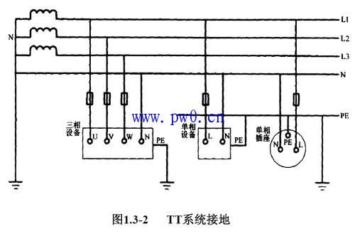 TT系统就是电源中性点直接接地、用电设备外壳也直接接地的系统,如图1.3-2所示。通常将电源中性点的接地叫做工作接地,而设备外壳接地叫做保护接地。TT系统中,这两个接地必须是相互独立的。设备接地可以是每 一设备都有各自独立的接地装置,也可以若干设备共用一 个接地装置,图1.3-2中单相设备和单相插座就是共用接地装置的。